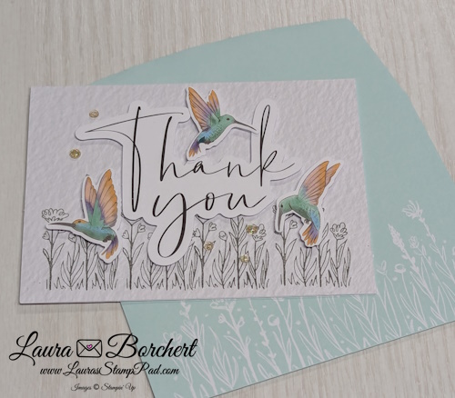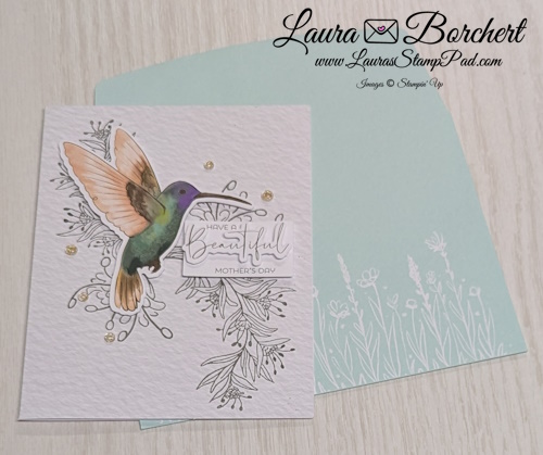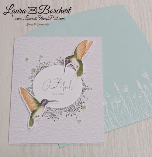 This card is probably my favorite mostly because here are 3 hummingbirds on it and they are just so beautiful! I love the gray stamped background and then hint of shine with the embellishments! TIP: For this card, you will stamp the grassy flower image along the bottom. You can stamp left to right but I find stamping in the middle and working my way out to work better with spacing!